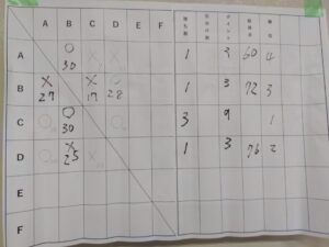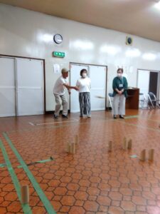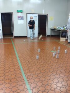 加賀屋福祉センター仕様の大会要綱に沿って総当たり戦が行われ「どこを狙おう」と作戦をたて思い通りにスキットルが倒れた時は歓声が上がっていました✨