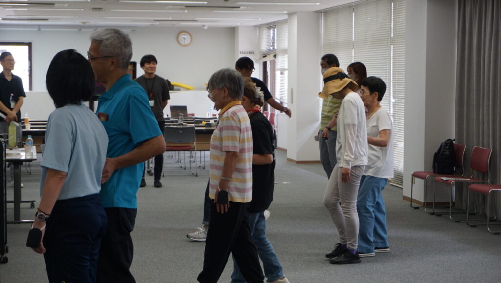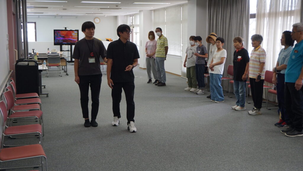 2人でペアになり、目を閉じて、目の不自由な方のガイド(手引き)の練習をしました。