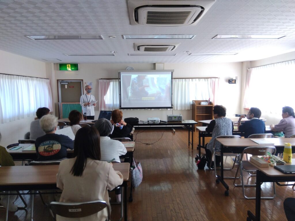 昨年は介護保険制度についてのクイズで盛り上がりましたが、今年はもっと具体的なイメージを知って欲しいと思い、利用者様と介護スタッフの具体的な関わりの分かる動画を視聴していただき、その解説や補足をさせていただきました。