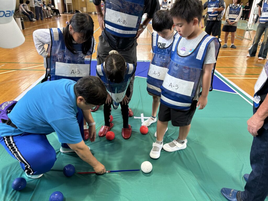 折からの雨も開催時刻にはほぼ上がり、それに合わせたようにたくさんの参加者が集まりました。小学生低学年をはじめ多様な年代の方々がチームを組み、ボッチャを楽しみました。ナイスショットが出るたびに歓声が上がり、体育館は和やかな雰囲気に包まれていました。狙いすぎたために、オウンゴール的なショットとなってため息がこぼれるシーンも。