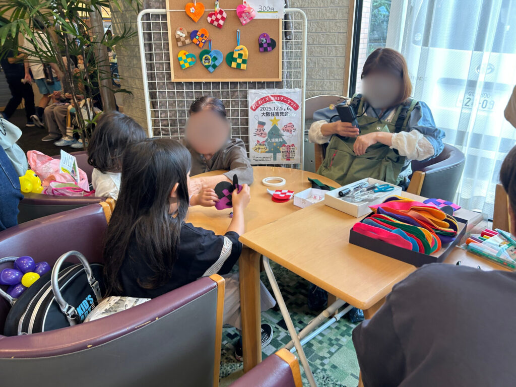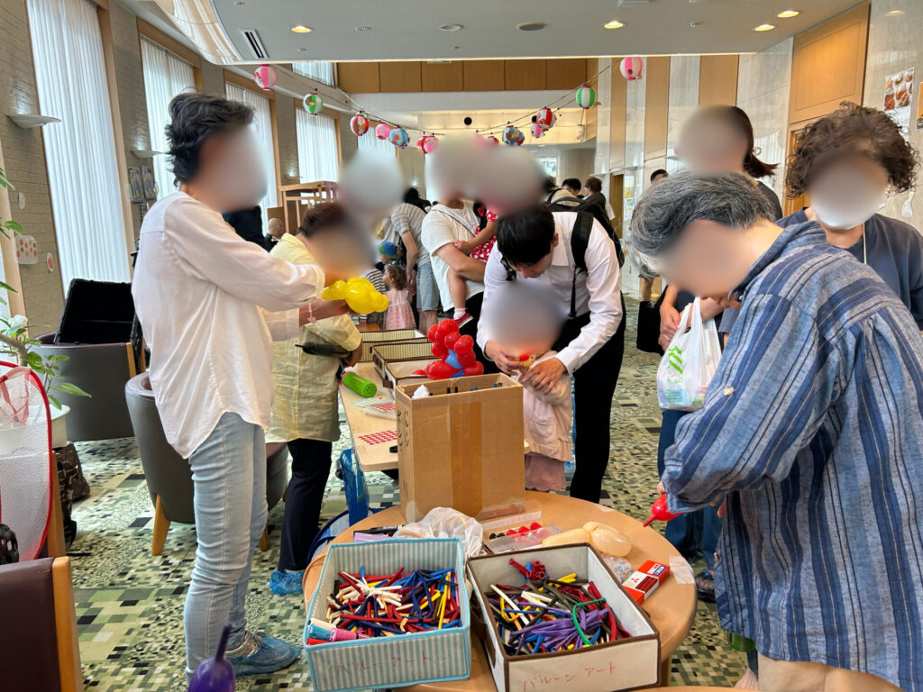 ◆ワークショップでは、フェルトを使った壁に飾る小物づくりを体験しました。昔作った経験がある高齢者は、体験している子どもの手をとって教えたりとても和やかな雰囲気で世代間交流の場がみられました。バルーンアートは人気で長い列が途切れることがなく品切れとなり残念そうな顔をしている子どもがいました。