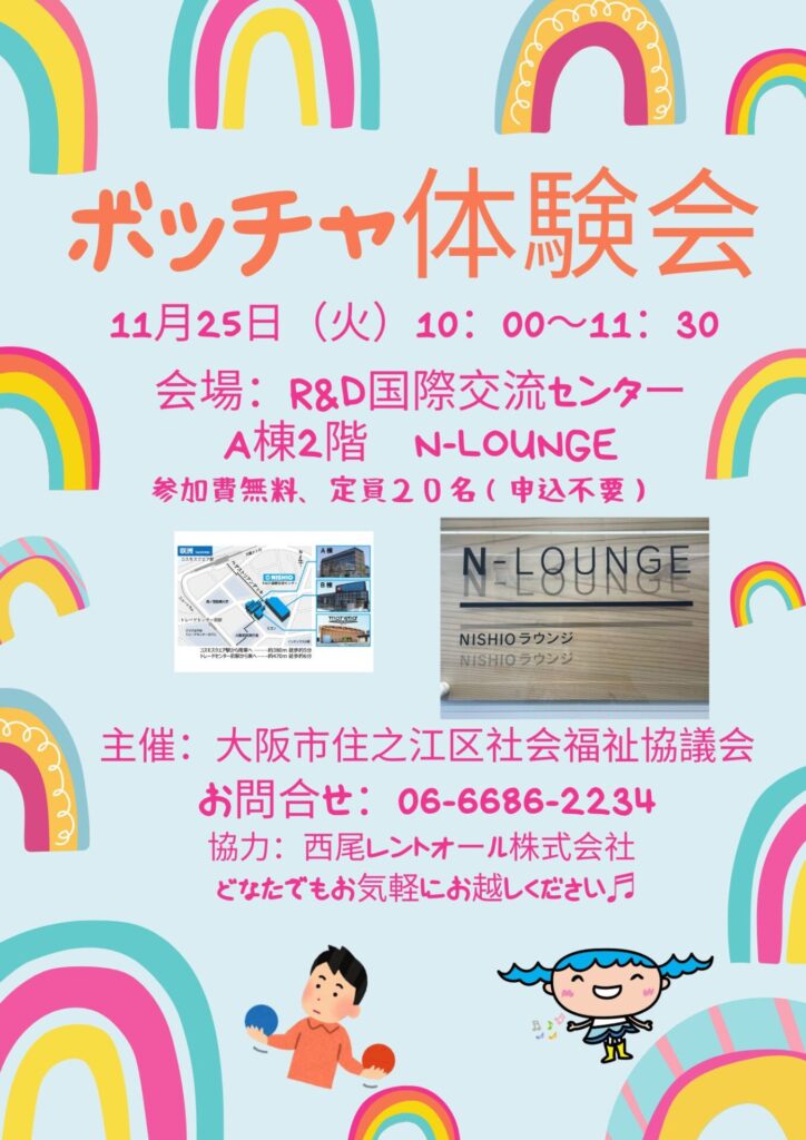 第2層生活支援コーディネーターの楊です。来る11月25日(火)10:00からR&D国際交流センター2階 N-LOUNGEにおいて「ボッチャ体験会」が開催されます!!申込は不要で、参加費無料となっております。どなたでもご参加いただけます。お気軽にお立ち寄りくださいませ♬