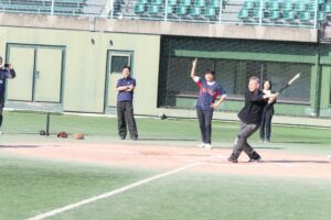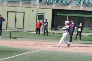 そして、自分の名前が電光掲示板に表示され、「4番サード〇〇くん」とアナウンスが流れました。昔、グラウンドでボールを必死に追いかけていた青春を思い出す瞬間でした。