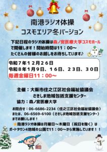 第2層生活支援コーディネーターの楊です。南港ラジオ体操は地域住民の温かなご協力のもと3年目に入りました。心より感謝申し上げます!さて、毎週金曜日にコスモ海浜緑地で開催されているラジオ体操は12月に入りますと、身体にこたえる強風が吹きすさびます。例年ですと休止にさせていただくのですが、熱心にお越しいただく参加者の方々みて、代替の開催場所を検討していました。すると、森ノ宮医療大学からご厚意を頂戴し、コスモホールを12月26日の金曜日から令和8年1月中にかけて使用させていただくことになりました。本当に有難いお話で、運営側としては感謝で胸がいっぱいになりました。