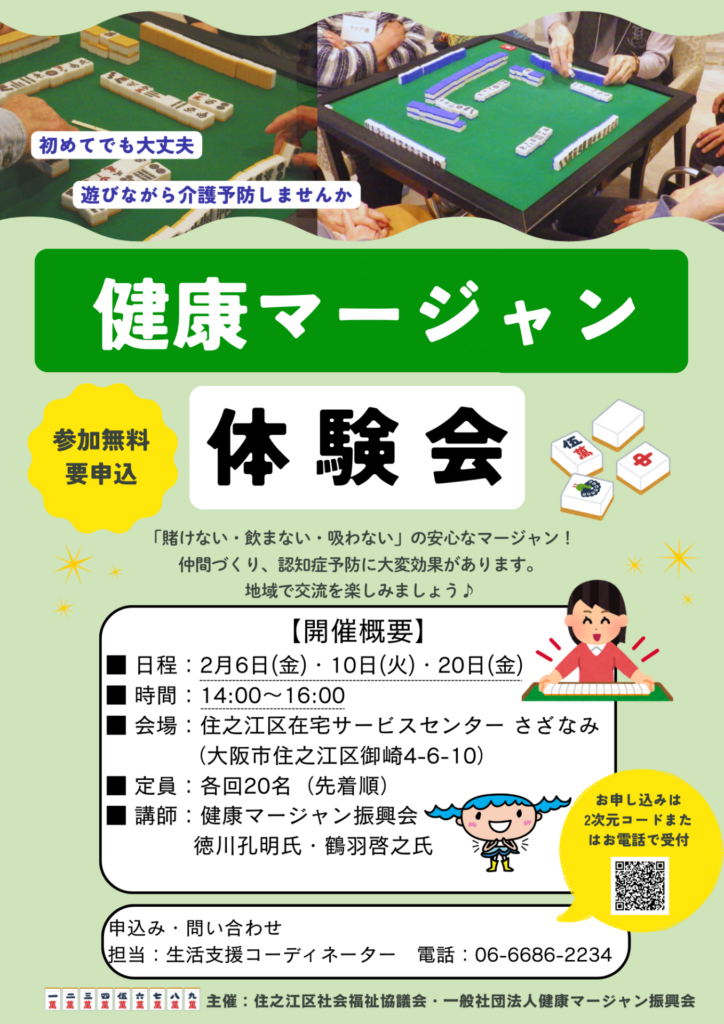 2025.12.20 講座 健康マージャン体験会を開催します♪ 「やったことがない」「難しそう」そんな方も大歓迎! 健康マージャンは、賭けない・飲まない・吸わない、誰でも安心して楽しめるマージャンです。 頭を使って考えるとともに指先を動かすので自然と脳の刺激や介護予防、気分転換につながります。初心者の方もスタッフが丁寧にサポートします。 気軽に、新しい楽しみを見つけてみませんか? 詳細はチラシをご覧ください♪
