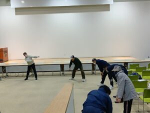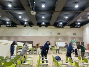 南港ラジオ体操のコスモエリアは海浜緑地で開催するのですが、12月後半から3月前半にかけて海からの寒風が強く、ラジオ体操の実施が困難となっていました。そんな状況の中、森ノ宮医療大学から救いの手を差し伸べていただき、大学構内のコスモホールをお借りすることができました、昨年の12月26日から数えて3回目になるこの日もラジオ体操の参加者に加えて、大学関係者、近隣企業からの参加も得て、賑やかな体操になりました。