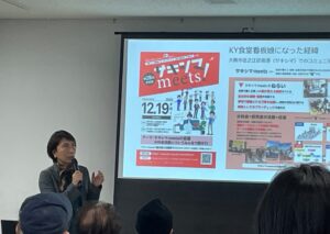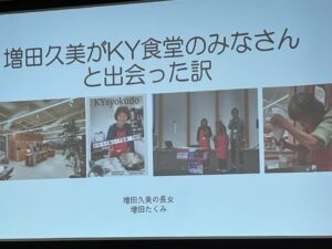 講演会は会場が60名を超える来場者でほぼ満席になりました。冒頭に娘様から久美さんの紹介があって、生い立ちから認知症発症直後、そこからの家族様の関わりなど詳細にお話しいただきました。1部の久美さんの日常とKY食堂の取り組みでは、KY食堂スタッフの菊池夫妻から動画の紹介や久美さんにまつわるクイズの出題があって会場は一気に温かな雰囲気に包まれていきました!支援する側、される側ではなく、久美さんらしさが存分に引き出されたKY食堂の取り組みが際立っていました。2部では久美さんの家族、まわりの支援者の視点をインタビュー形式でそれぞれが回答していきました。エピソードを交えた視点や久美さんとの思い出など感慨深いものがありました。