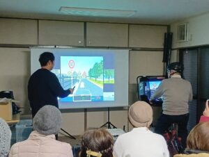 講義で学んだことをふまえて、学校までの道のりと商店街の自転車シュミュレーションを用いて危険予測を体験しながら2名の参加者に体験していただきました。
